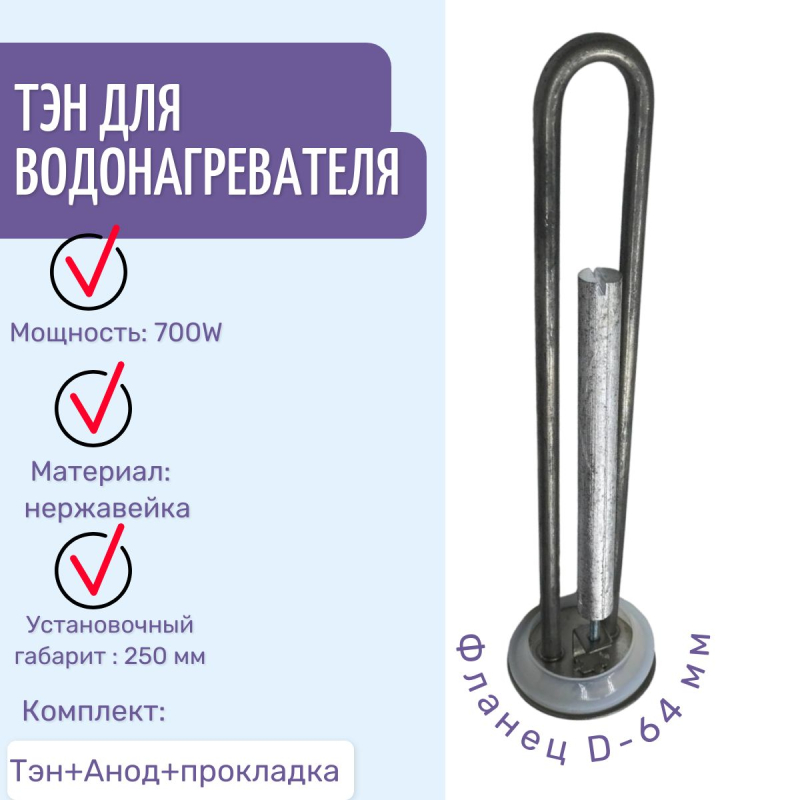 Тэн 2500W, 220V резьба G 1 1/4" (D-42мм) с терморегулятором (Аристон)